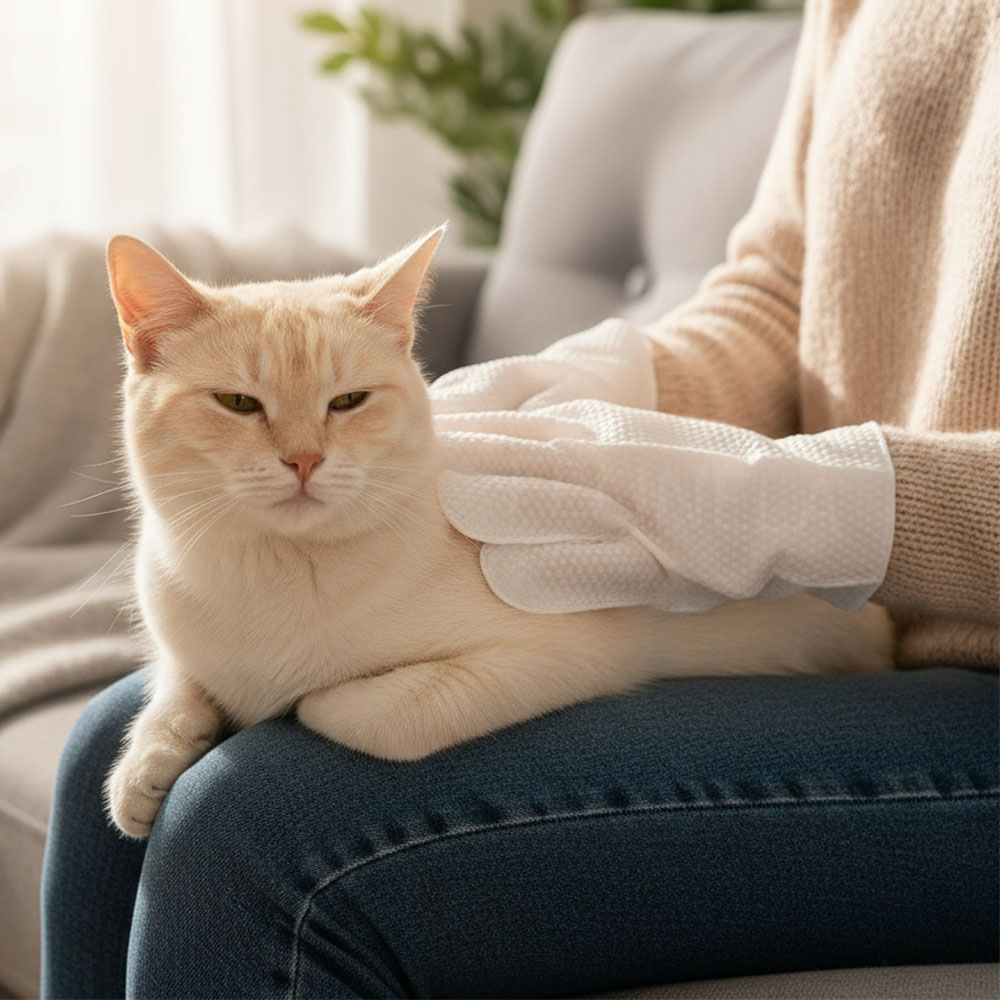Die Reinigungshandschuhe für Katzen ohne Wasser – CatGlow (6er) bieten eine einfache Möglichkeit, das Fell zwischendurch zu reinigen. Einfach die Hand in den mit Essenz getränkten Handschuh stecken und sanft über das Fell streichen – Pollen, Sand und unangenehme Gerüche werden in wenigen Momenten entfernt. Für die Katze fühlt es sich wie normales Streicheln an, für Sie bedeutet es Sauberkeit ohne Bad. Eine alltagstaugliche Pflege mit Frische-Effekt – ganz ohne Stress.