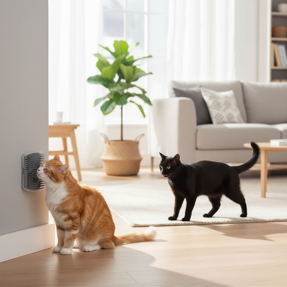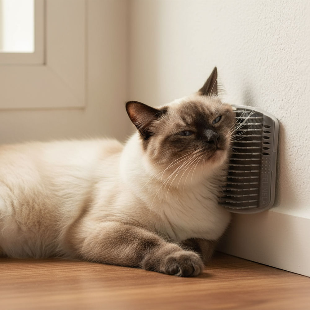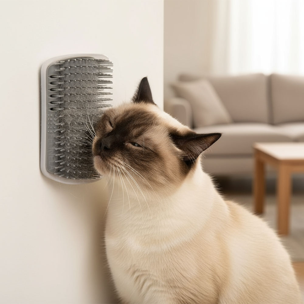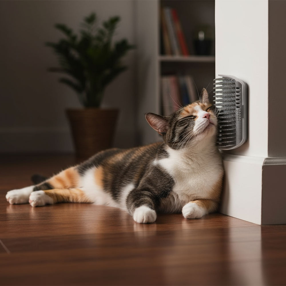 Das Reiben an Wänden, Ecken und Möbelkanten gehört für viele Katzen dazu. Oft bleiben dabei sichtbare Spuren zurück, die sich nur mühsam entfernen lassen. Die Bürste gibt deiner Katze einen festen Punkt zum Reiben und Markieren. Dieses unauffällige Detail lenkt die Aufmerksamkeit weg von deinen Wänden und Möbeln, sodass sie nicht mehr unter dem Katzenritual leiden.